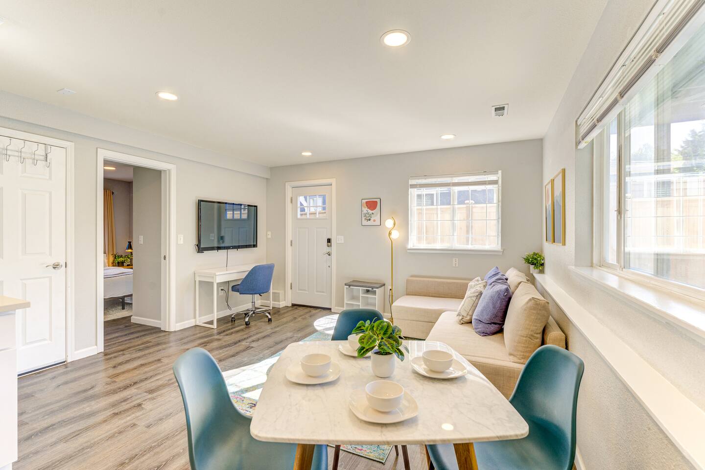 This apartment is on the first floor of a single-family home in a safe and walkable neighborhood. It is equipped with a comfy queen bed, a sofa bed in the living room, 50-inch flat screen, full kitchen, desk/chair, and dining area.